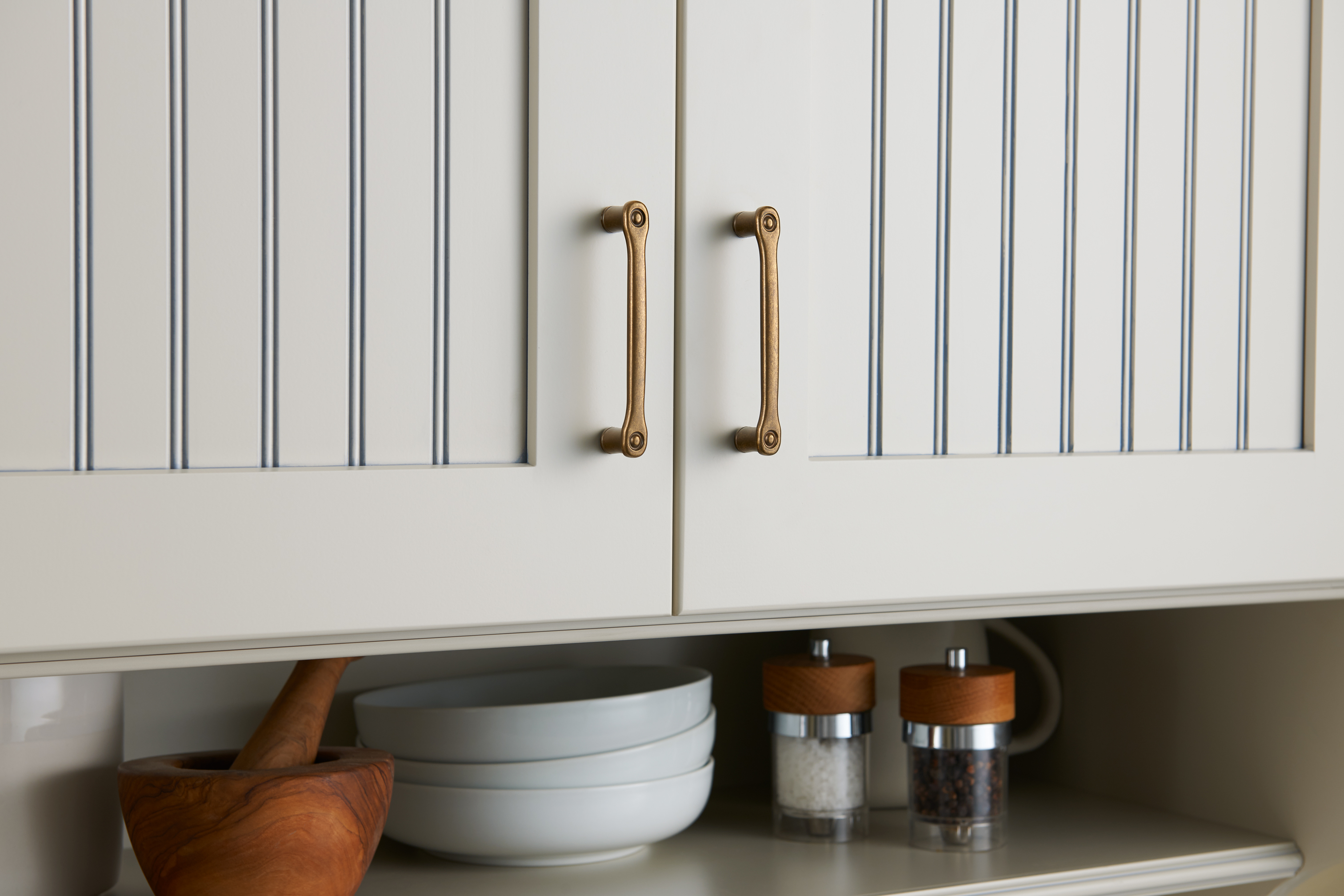 Open Shelves like this one provide easy access to commonly used items, plus a display space for favorite knick-knacks. The hardware pictured is from the Edwardian Collection by Top Knobs Hardware