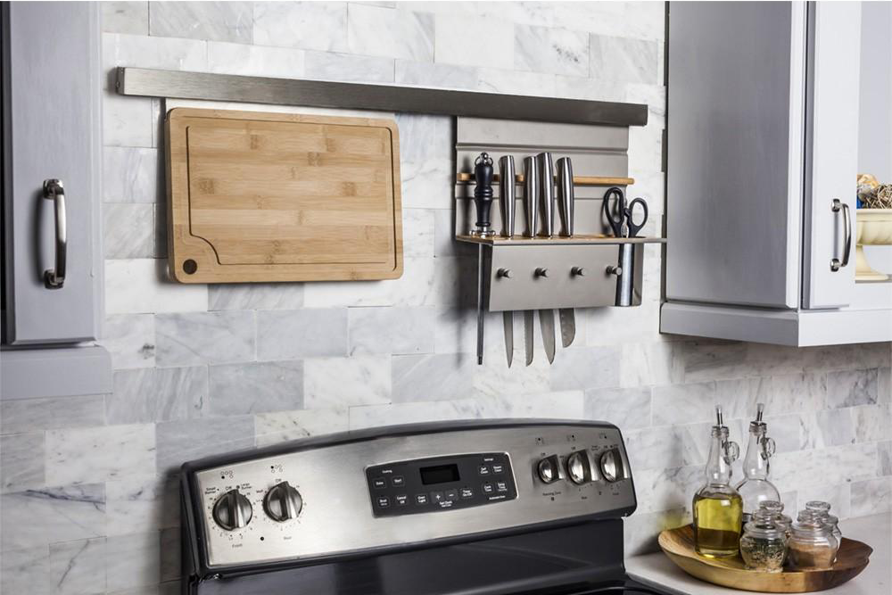 Pictured: The Smart Rail System by Hardware Resources offers flexible wall storage with a minimalist design.